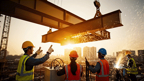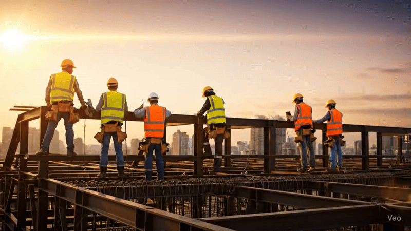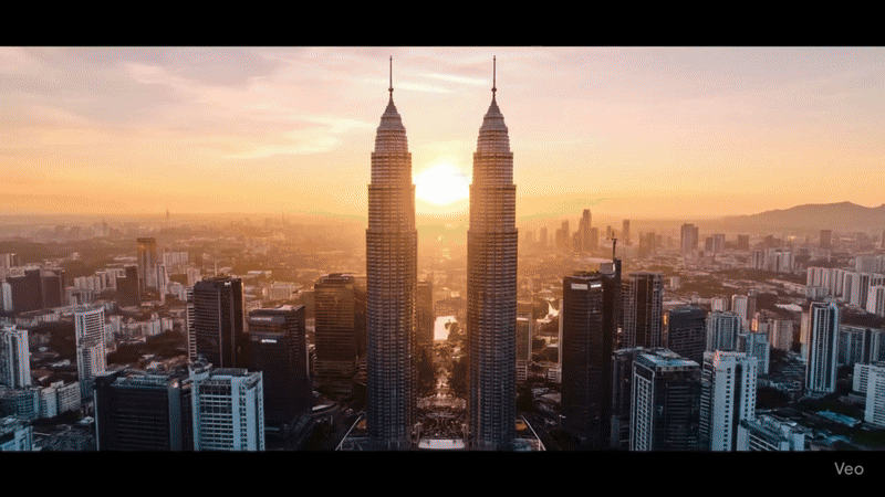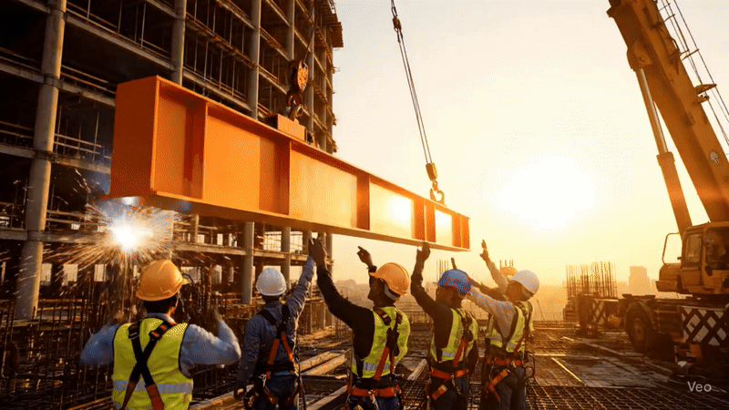 Prompt: An 8-second, powerful and cinematic video set against the backdrop of a high-rise construction site during the golden hour. The scene opens with a dynamic, low-angle tracking shot following a massive steel beam as it is hoisted upwards by a crane. Below, a diverse team of construction workers guide it into place, with sparks flying from welders in the background. The sun glints off the steel and the workers' helmets. As the beam swings past the camera, it creates a natural wipe transition. On the other side of the wipe, the camera is now on a tight close-up of a Malaysian engineer standing on a higher level of the structure. He is wearing a white hard hat and a determined, proud expression. He turns his head from overseeing the work to look directly and confidently into the camera, and says with a clear Malaysian accent: “And with unity, we build.” The final shot holds on his face as the sounds of construction continue around him. The shot is epic, with lens flare from the setting sun. 4K.