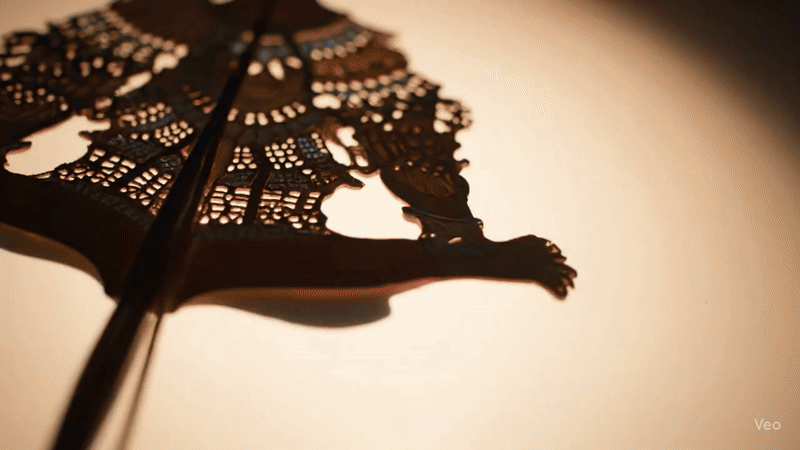 "The scene opens on an extreme close-up of a traditional leather Wayang Kulit puppet... The camera performs a slow, seamless tilt downwards... the shadow is... cast onto the display of an iPad... the warm, organic shadow dissolves and transforms into a vibrant, glowing teal holographic animation..."